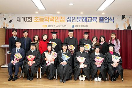 목포공공도서관은 지난 16일 제10회 초등학력인정 성인문해교육 졸업식을 개최했다. 3년간의 초등학력인정 성인문해교육 과정을 이수한 이번 졸업생들의 평균 연령은 75세로, 그 중 최고령자(82세)를 포함한 11명의 학습자들이 학력인정서와 졸업장을 받았다.