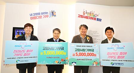 전남개발공사와 경북개발공사는 20일 NH농협은행 전남영업부와 경북지역본부를 각각 방문해 500만원을 서로 기부하고, 상호 지역의 고향사랑기부제 활성화를 응원했다.