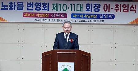 신임 김영락 노화읍번영회장은 취임사에서 \"노화읍번영회가 이자리에 오기까지 많은 선·후배들과 역대 회장들의 아낌없는 노화사랑, 지역발전을 위해 헌신·봉사한 결과\"라며 \"회원 여러분 우리읍에서 일어나고 있는 각종 현안사업과 주민생활 불편, 각종 규제사항 등을 면밀히 검토하고 분석, 추진해 살기 좋은 고장 만들기에 최선을 다하겠다\"고 밝혔다.