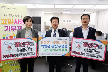 이날 박 청장은 NH농협은행 광산구청지점을 방문해 자매·우호 도시인 부산 동구, 경남 함양군, 대구 수성구, 경기도 이천시를 비롯해 광주전남북부권 상생발전 협의회에 속한 담양군, 장성군, 광주 북구 및 인접 도시인 나주시, 영광군, 함평군 등 총 10개 도시에 고향사랑기부금을 기탁했다.