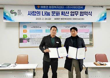 순천시 해룡면은 지난 24일 ㈜국제이엔씨와 나눔문화 확산 및 선도를 위한 업무협약식을 해룡면 행정복지센터 대회의실에서 열었다.