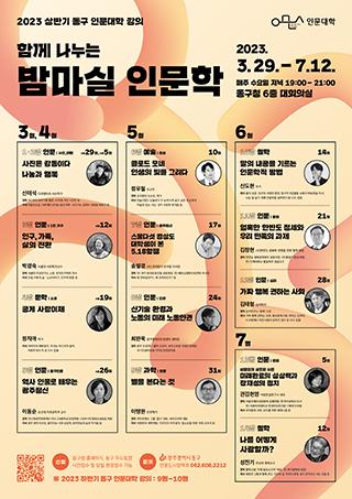 광주 동구(청장 임택)는 ‘함께 나누는 밤마실 인문학’을 주제로 다수의 명망 있는 강사들을 모시고 올해 상반기 동구 인문대학을 개강한다고 밝혔다.