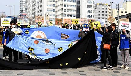 단체는 회견문을 통해 \"2011년 3월 11일 후쿠시마 핵 발전소 사고가 발생한 지 12년이 지났지만 핵 사고 재앙은 여전히 진행 중이다. 후쿠시마 핵 발전소 내 핵 연료 파편 수백t은 여전히 방사성 오염수, 핵폐기물을 만들어내고 있다\"고 주장했다.