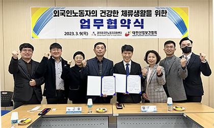 광주외국인노동자지원센터와 대한산업보건협회 광주전남북지역본부는 9일 센터에서 지역 내 외국인노동자의 건강증진을 위한 상호협력을 약속하는 업무협약(MOU)을 체결했다.