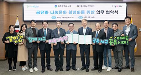 광주시 서구(구청장 김이강)가 나눔과 공유, 협업을 통해 선도적인 공유도시로의 도약을 선언했다. 서구는 23일 서구청 3층 나눔홀에서 (사)광주재능기부센터(대표 장우철)와 공유문화 확산을 위한 업무협약을 체결하고 ‘함께 서구, 지속가능한 공유 서구’비전 선포식을 개최했다.