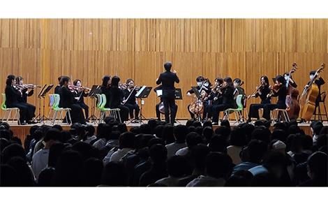 23일 일동중에 따르면 이번 방문음악회는 광주시향의 ‘찾아가는 음악회’의 하나로 진행됐다. 영화OST와 탱고, 목관과 현악 앙상블 등으로 구성된 다채로운 연주가 음악회 동안 이어졌다. 봄이 약동한 교정에서 음악회는 새학기에 바쁜 학생과 교직원들에게 활력과 큰 감동을 선사했다.