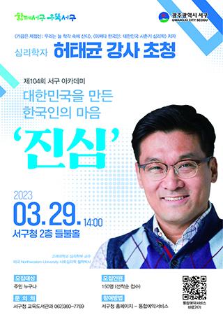광주시 서구(구청장 김이강)는 29일 서구청 들불홀에서 사회심리학자 허태균 교수(고려대)를 초청해 ‘대한민국을 만든 한국인의 마음: 진심’을 주제로 제104회 서구 아카데미를 개최한다.