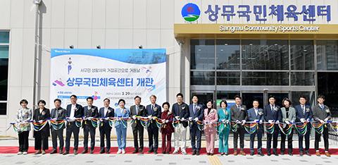 상무국민체육센터는 지역의 숙원사업으로 2018년 국토교통부 생활밀착형 국민체육센터 공모사업에 선정되어 국·시비를 포함 총 110억원의 예산을 들여 5년 만에 완공됐다.