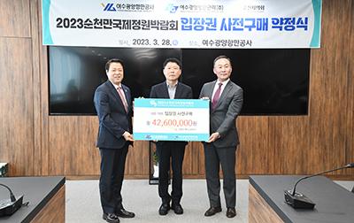 순천시의회는 지난 28일 월드마린센터에서 여수광양항만공사·여수광양항만관리(주)와 2023순천만국제정원박람회 입장권 구매약정을 체결했다.