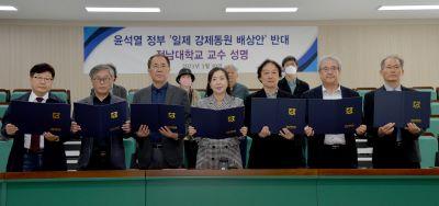 전남대학교 교수 218명은 30일 오후 광주 북구 전남대 대학본부 1층 세미나실에서 기자회견을 열고 \"윤석열 정부의 일제 강제동원 배상안은 헌법적 가치와 역사 정의에 역행한다\"며 철회 촉구 성명서를 발표했다.