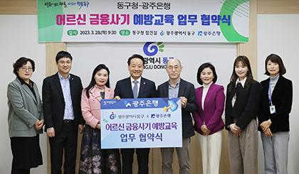 동구는 지난 28일 박종춘 광주은행 부행장이 참석한 가운데 ‘어르신 금융사기 예방 교육’ 운영을 위한 업무 협약을 체결하고, 경로당 당장, 총무를 대상으로 교육을 진행했다.