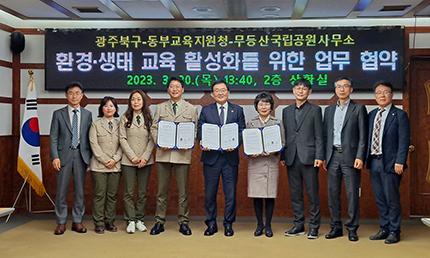 광주동부교육지원청이 30일 북구청 상황실에서 북구청·무등산국립공원사무소와 ‘환경·생태교육 활성화 및 2045 탄소중립 실현 교육 네트워크 구성’ 업무 협약을 체결했다.