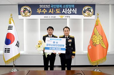 광주시소방안전본부는 소방청 주관 2023 국민행복소방정책 평가에서 특·광역시 부문 2위를 차지, 우수상을 수상했다고 31일 밝혔다.