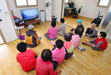 4일 오전 함평군 신광면 한 한 경로당에서 전날 발생한 야산 화재로 대피한 주민이 산불 생중계 뉴스를 보고있다.