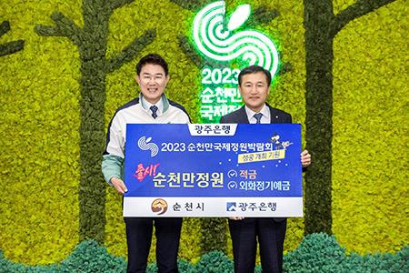 앞서 지난 3일 광주은행 순천지점에서 노관규 (재)순천만국제정원박람회 조직위원회 이사장(순천시장)과 고병일 광주은행장이 ‘순천만정원적금’과 ‘순천만정원 특판 외화정기예금’에 각각 1호 가입자로 나서며 ‘2023순천만정원국제정원박람회’의 성공적인 개최를 기원했다