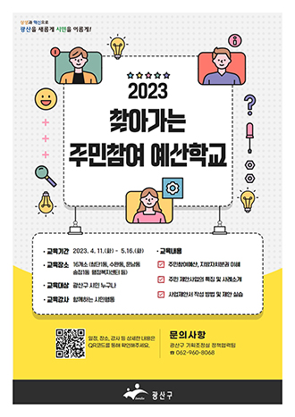 주민참여예산제 또는 찾아가는 주민참여예산학교에 대한 자세한 안내는 광산구 기획조정실(062-960-8068)로 문의하면 된다.