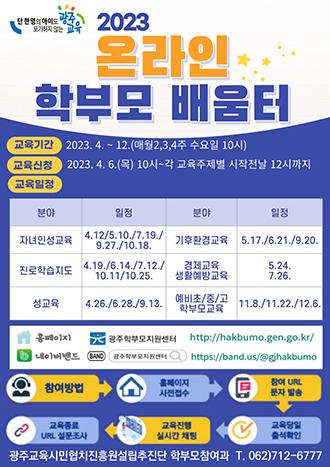 한편 교육신청은 6일 10시부터 각 과정별 교육전날 12시까지 광주학부모지원센터 누리집(http://hakbumo.gen.go.kr)에서 사전 신청 가능하다. 자세한 내용은 광주교육시민협치진흥원설립추진단 학부모참여과(02-712-6777~8)로 문의하면 된다.