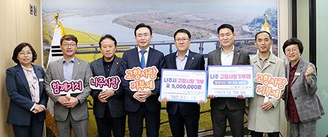 나주시(시장 윤병태)는 ㈜대신육가공 조개동 회장이 고향사랑기부금 최고액인 500만원을 기탁했다고 5일 밝혔다.