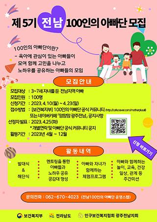 전남도는 육아에 관심이 많은 초보 아빠들이 함께 고민을 나누고 육아경험과 노하우를 공유하는 \'제5기 전남 100인의 아빠단\'을 모집한다고 9일 밝혔다.