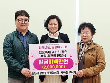 순천시 삼산동통장협의회·새마을부녀회는 제9회 용방뚝방길 벚꽃축제 먹거리 장터를 운영해 올린 수익금 200만 원을 저소득층을 위한 후원금으로 기탁했다.