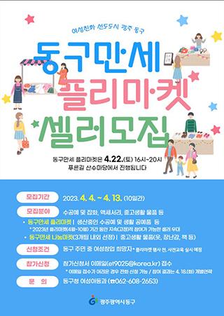 광주 동구(청장 임택)는 푸른길 공원 산수문화마당에서 열리는 올해 첫 ‘동구만세 플리마켓’에 참여할 셀러(판매자)를 오는 13일까지 모집한다고 밝혔다.