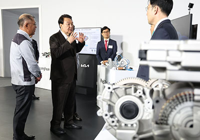 윤석열 대통령이 11일 경기도 화성 기아자동차 오토랜드 화성에서 열린 전기차 전용공장 기공식에 앞서 상생협력부스를 참관하고 있다. 2023.04.11.