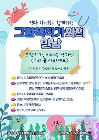 15일 ‘엄마 아빠와 함께하는 그림책 작가와 만남’은 환경부 선정 우수 환경도서 ‘우리 곧 사라져요’의 이예숙 작가를 초청해 특별강연을 연다. 강연은 작가와 함께 책 읽기, 자연에 대한 강연과 독후 활동을 진행한다. 이어 송정공원에서 22일 가족 단위로 자연탐구·생태놀이·원예체험 등 온 가족이 함께 할 수 있는 다양한 행사가 기다리고 있다.