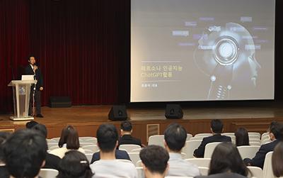 이날 교육은 동구 소재 AI 창업캠프 입주기업인 유승재 ㈜페르소나AI 대표를 초청해 ▲챗GPT 개념과 기술 ▲챗GPT 사용 방법 시연 ▲활용 사례 ▲구정 활용 방안 등을 공유했다.