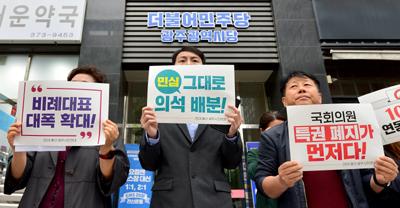 광주 시민단체와 소수 정당이 \'선거제 개혁\'을 두고 국회 전원위원회가 별다른 성과를 내지 못한 것을 규탄하며 거대 양당의 적극적인 논의를 주문했다.
