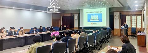 이날 연수는 광주시 감사위원회 임대진 감사2팀장을 초빙해 ‘내부통제와 감사역량 강화’라는 주제로 펼쳐졌다. 작년부터 감사원 심사평가 항목에 추가된 내부통제 시스템에 관한 내용을 포함해 문답서 작성 방법 등 감사기법에 대한 전반적인 내용을 다뤘다.