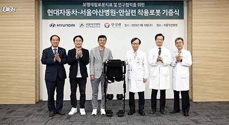현대차는 19일 서울 송파구 서울아산병원에서 열린 \'보행재활 로봇치료 및 연구협력을 위한 착용로봇 기증식\'에서 의료용 착용로봇 2대를 전달했다.