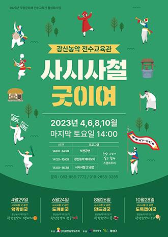 ‘사시사철 굿이여’는 공연과 체험, 교육을 통해 유네스코 세계무형유산인 농악을 다방면으로 알아보는 프로그램이다. 문화재청과 광산구가 주관하는 ‘2023년 무형문화재 전수교육관 활성화 지원사업’의 일환이다.