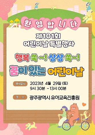 광주유아교육진흥원이 오는 29일 제101회 어린이날 맞아 부모와 함께하는 특별 가족 체험 ‘행복 쑥~! 상상 쑥~! 꿈이 있는 어린이날’ 행사를 실시한다.