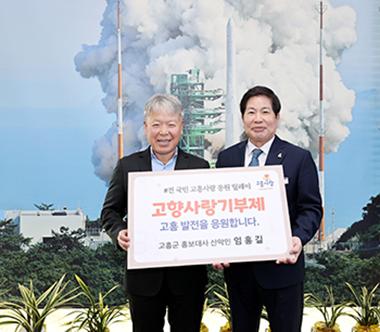 26일 고흥군에 따르면 산악인 엄홍길씨가 고흥군 홍보대사 위촉식에서 \'고향사랑기부금\'을 기탁했다.