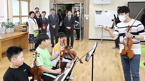이주호 부총리는 이날 학교오케스트라 개인별, 소그룹지도 및 올해 새롭게 도입된 365+ 체육온활동 등을 참관하고 그린스마트미래학교 구축으로 사용 중인 모듈러 교실을 둘러봤다. 이어 차담회를 통해 학교 예술·체육 활성화를 위한 지역자원 연계 방안 등에 대한 현장 의견을 청취했다.