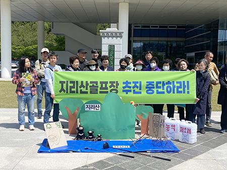 구례 주민 등으로 구성된 \'사포마을 골프장 건설 저지를 위한 비상대책위원회\'(이하 주민)는 2일 오전 전남도청 앞에서 \'지리산골프장 추진 중단 촉구·감사청구\'기자회견을 열고 \"구례군과 골프장 업자 사이에 특혜와 부적정 업무 처리가 있었는지에 대해 전남도의 특별 감찰을 촉구한다\"며 이같이 밝혔다.