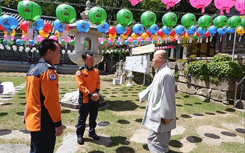 특히 사찰 내 소화기, 옥외소화전, 자동확산소화기 등 소방시설을 점검하고 부처님 오신 날 행사에 대비해 화재발생 때 초기 대처·대피방법 교육, 화재예방 안전수칙을 당부했다.