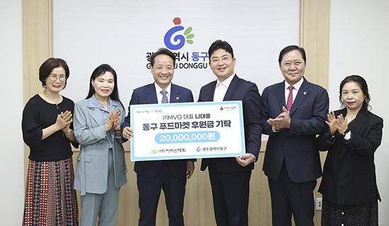 광주 동구(청장 임택)는 나대웅 MVG그룹㈜ 대표로부터 동구푸드마켓 운영을 위해 사용해달라며 후원금 2천만 원을 기탁받았다고 밝혔다.