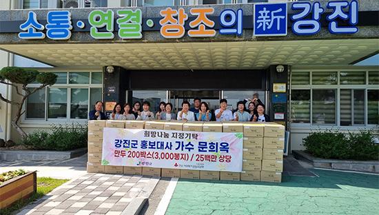 전남 강진군은 전통 트로트 여제 문희옥 씨와 남편 김양일 씨가 지역 복지시설에 2500만 원 상당의 만두 200박스(3000 봉지)를 전달했다고 10일 밝혔다.