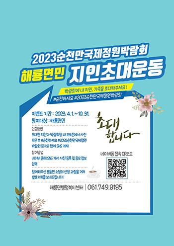 이벤트는 박람회 운영기간 동안 진행되며 네이버폼에 챌린지 참여 인증 및 응모 정보를 입력해 참여할 수 있다. 초대한 지인과 박람회장 내에서 찍은 사진을 #순천하세요, #2023순천만국제정원박람회 문구와 함께 개인 사회관계망서비스(SNS)에 게시한 후 해당 내역을 캡쳐해 네이버폼에 첨부하면 된다. 사은품으로는 선정과정을 거쳐 발효커피를 제공할 예정이다.
