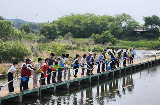 광산구는 11일 보건소, 민간방역업체, 지역주민 40여 명이 참여한 가운데 송산유원지에 미꾸라지 40kg을 방류했다. 이를 시작으로 앞으로 장수천 등 54개소에 260kg의 미꾸라지를 방류할 예정이다.