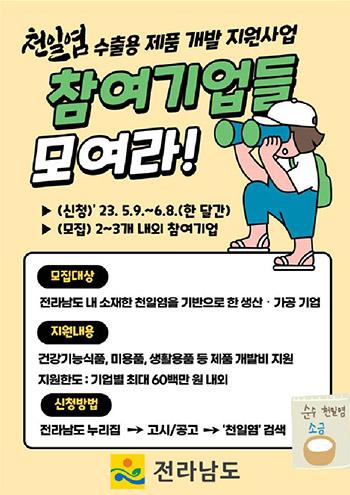 \'천일염 수출용 제품 개발 지원사업\'은 오는 6월 8일까지 접수하며, 자세한 내용은 전남도 누리집(http://jeonnam.go.kr) 고시·공고란에서 확인해 신청하면 된다.