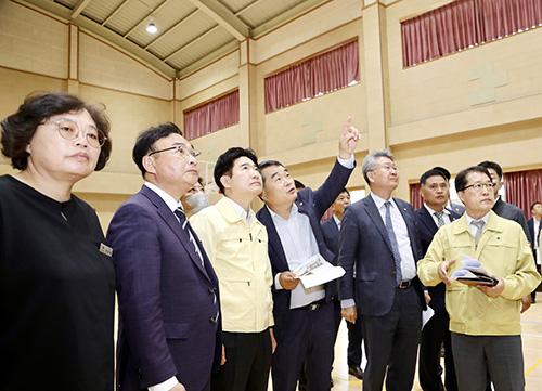 김대중 교육감을 비롯한 교육청 관계자와 국회의원, 전남도의원 등이 12일 벽체 구조물 낙하사고가 발생한 여수 한 초등학교 강당을 살펴보고 있다. /전남도교육청 제공