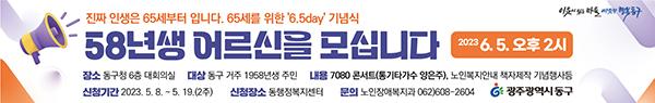 광주 동구는 올해 65세가 되는 관내 어르신을 대상으로 노인복지서비스 정보 안내와 문화 공연이 마련된 ‘6·5데이(day)’ 기념식에 참석할 신청자를 오는 19일까지 모집한다고 밝혔다.