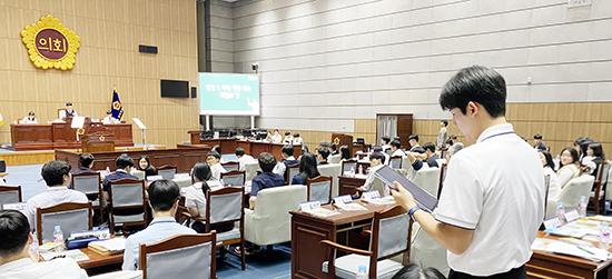 시의회를 대표해 환영 인사를 한 강수훈 의회운영위원장은 “고등의회 학생의원들의 자치역량이 매우 뛰어나 깜짝 놀랐다”며 “학생들의 의회민주주의 체험을 위해 의회 공간을 적극 개방하고, 앞으로도 고등의회와 협력해 학생 관련 정책을 반영하는 데 앞장서겠다”고 소감을 밝혔다.