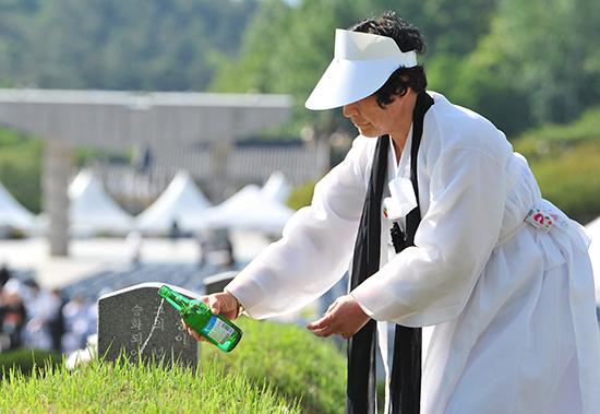 5·18민주화운동 43주기를 하루 앞둔 17일 오전 광주 북구 운정동 국립5·18민주묘지에서 고(故) 임수춘 열사의 아내 윤삼례 여사가 남편의 묘소에 소주를 붓고 있다. 2023.05.17.
