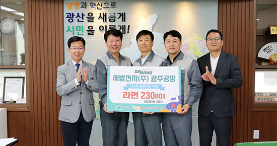 세방전지(주) 광주공장은 17일 광산구청에서 전달식을 갖고 라면 230상자(500만 원 상당)를 투게더광산 나눔문화재단에 기탁했다. 광주글로벌모터스(GGM) 등 노동자 자녀 보육을 위해 운영되고 있는 빛그린산단 직장어린이집도 이날 원생들이 ‘아나바다’ 행사를 통해 모은 수익금 120만 원을 투게더광산 나눔문화재단에 기부했다.