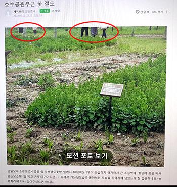 게시 글을 옮겨서 소개하면, \"금일(11일) 오후 5시께 호수공원 앞 쑥부쟁이꽃밭 옆에서 40대 여성 5명이 꽃삽까지 챙겨 와서 화단 꽃을 파서 쇼핑백에 담는 모습을 촬영했다\"며 \"가까이 다가가니 이들이 피해서 가는 뒷모습과 돌아보는 모습을 카메라에 담았는데 참 씁쓸하네요. 제자리에 다시 심어주셨으면 합니다\"라고 적었다.