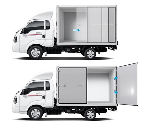 기존 소형 트럭의 적재함 측면 도어는 대부분 양쪽으로 밀어 여는 방식만 제공되고 있어 일정 크기 이상의 물건을 하차하기 위해선 후방 도어를 이용해야 한다. 측면 도어는 전·후방 단차로 인해 구조적으로 적재공간 안쪽으로 문이 이동되기 때문에 도어 두께만큼 내부공간의 손실이 발생한다.
