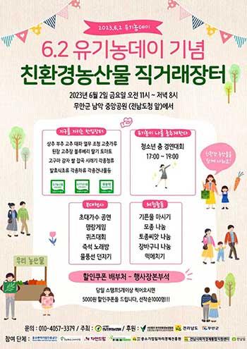전남도는 오는 6월2일 남악 중앙공원에서 친환경 유기농업의 국민적 인식 확산과 친환경 농산물 소비 촉진을 위한 \'2023 유기농데이 기념행사\'를 개최한다고 29일 밝혔다.